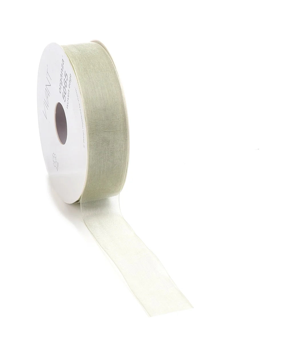 50mtr. Luxuriöses Organzaband mit gewebter Kante, sodass das Organzaband absolut nicht ausfranst. Dieses Organzaband ist in verschiedenen Breiten erhältlich. Wir liefern Organzaband Nilgrün ab Lager.