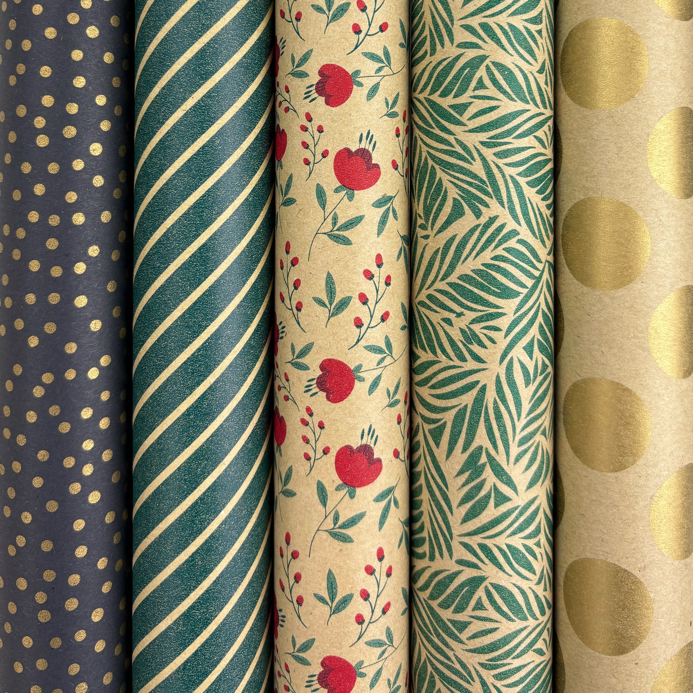 Verleihen Sie jedem Geschenk einen stilvollen und nachhaltigen Look mit diesem Set aus fünf Rollen Gras- und Kraftpapier mit verspielten Mustern in Grün-, Rot- und Goldtönen. Die Motive reichen von Punkten und Streifen bis hin zu Blumen- und Blätterprints, sodass Sie für jeden Anlass den passenden Look finden.
