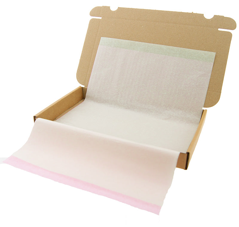 You'll receive 24 sheets of lime green and 24 sheets of pastel pink tissue paper, allowing you to beautifully layer the contents or alternate colors per order. The white SizzlePak-style filler paper fills the box nicely and makes the pastel colors pop.