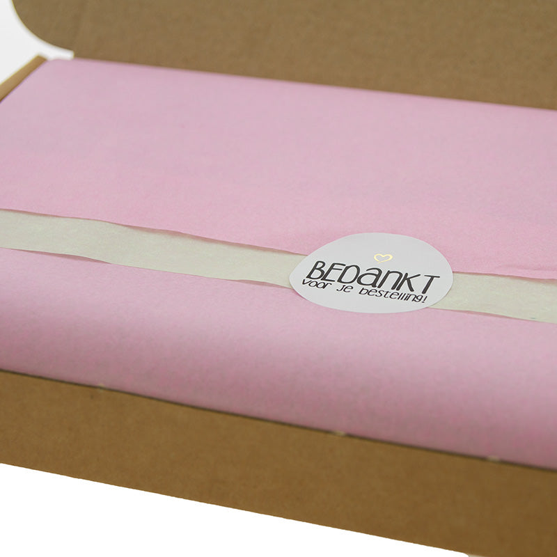 The white "Thank you for your order" sealing stickers complete the package. They neatly seal the tissue paper and give your customer a friendly thank you when they open the box.