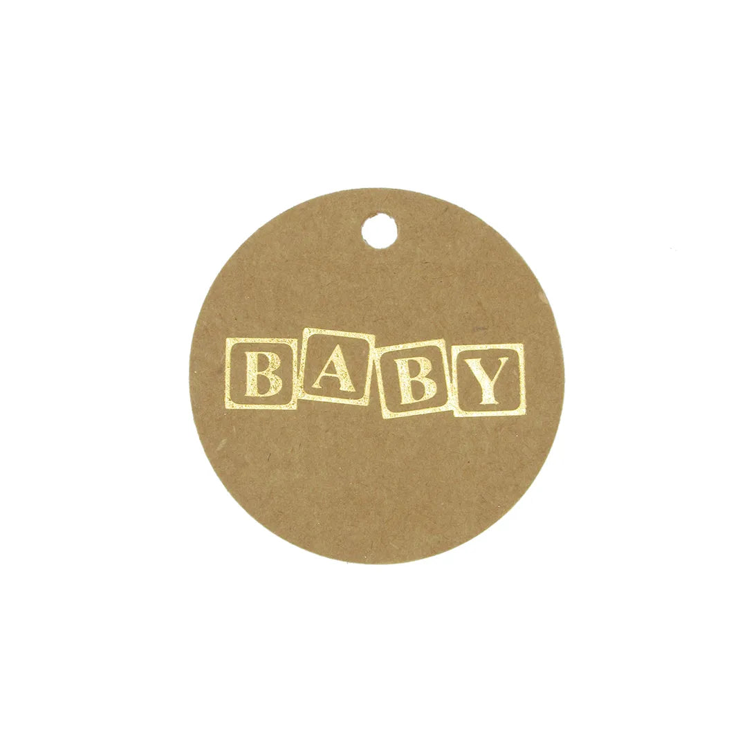 Kraftlabel Babyblok Gold / 50 pcs. Kraft cardboard gift hanger with high-gloss gold-colored blocks. Size of this label is 5cm. diameter. These hangers are supplied without string.